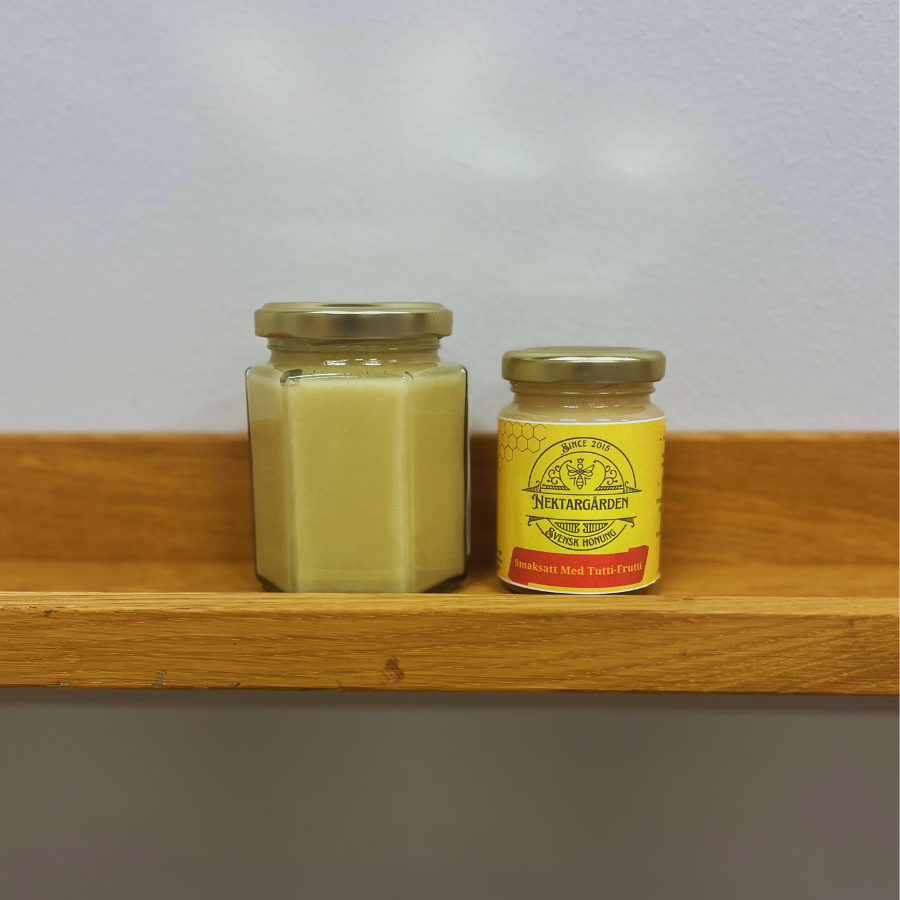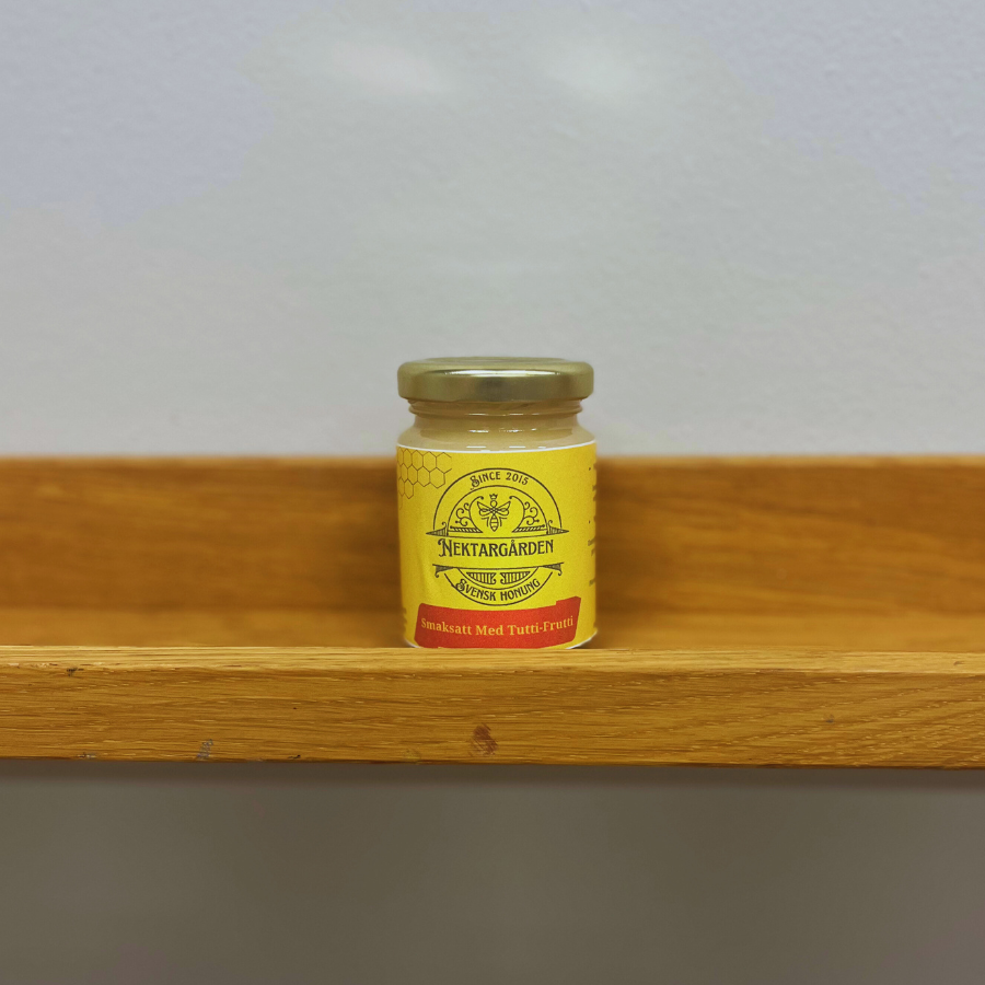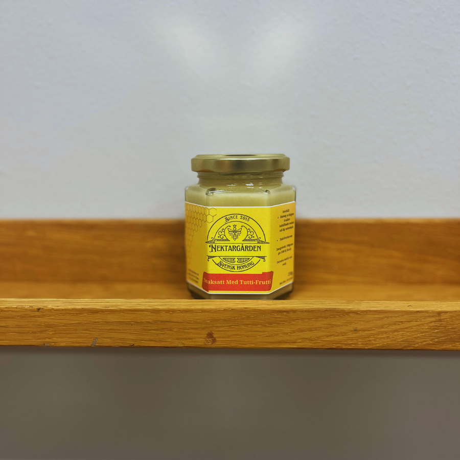Smaksatt honung med tutti-frutti är en lekfull och färgstark variant av vår svenska honung. Här möts naturlig sötma från honungen med en fruktig tutti-frutti-smak som väcker barndomsminnen och passar perfekt när du vill ha något utöver det vanliga.